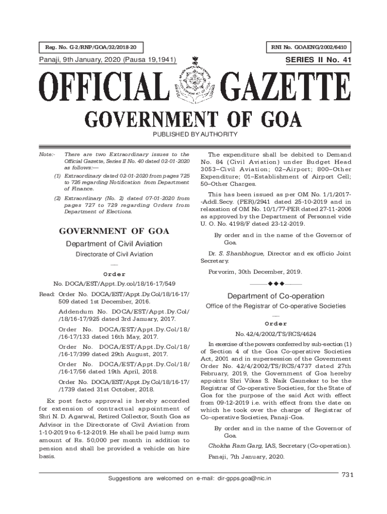 Reg. No. G2/RNA/GOA/32/201820RNI No. GOING/2002/6410SERIES II No. 41Panaji, 9th January 2020 (Paula 19, 1941)PUBLISHED BY AUTHORITY Note:There are two Extraordinary issues to the Official Gazette,