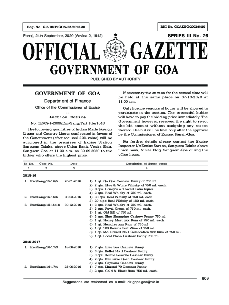 RNA No. GOING/2002/6410Reg. No. G2/RNA/GOA/32/201820SERIES III No. 26Panaji, 24th September 2020 (Asia 2, 1942)PUBLISHED BY AUTHORITYGOVERNMENT OF GOA Department of Finance Office of the Commissioner