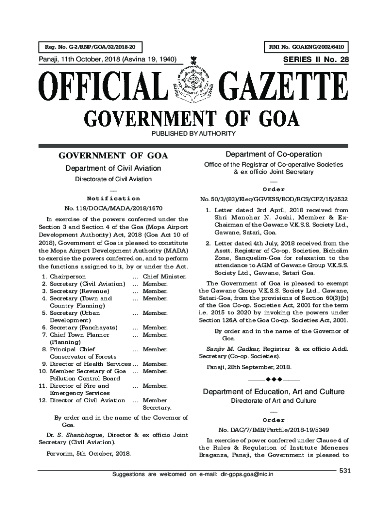 Reg. No. G2/RNA/GOA/32/201820RNI No. GOING/2002/6410SERIES II No. 28Panaji, 11th October 2018 (Asia 19, 1940)PUBLISHED BY AUTHORITYGOVERNMENT OF GOA