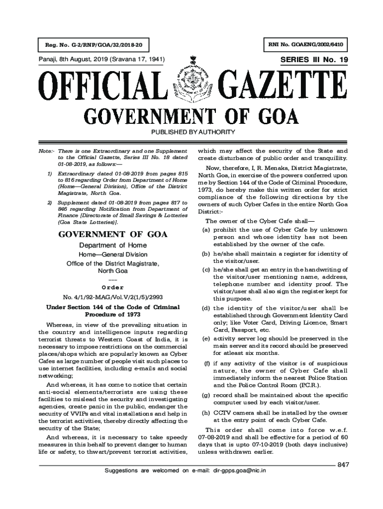 RNA No. GOING/2002/6410Reg. No. G2/RNA/GOA/32/201820SERIES III No. 19Panaji, 8th August 2019 (Havana 17, 1941)PUBLISHED BY AUTHORITY Note: There is one Extraordinary and one Supplement to the Official