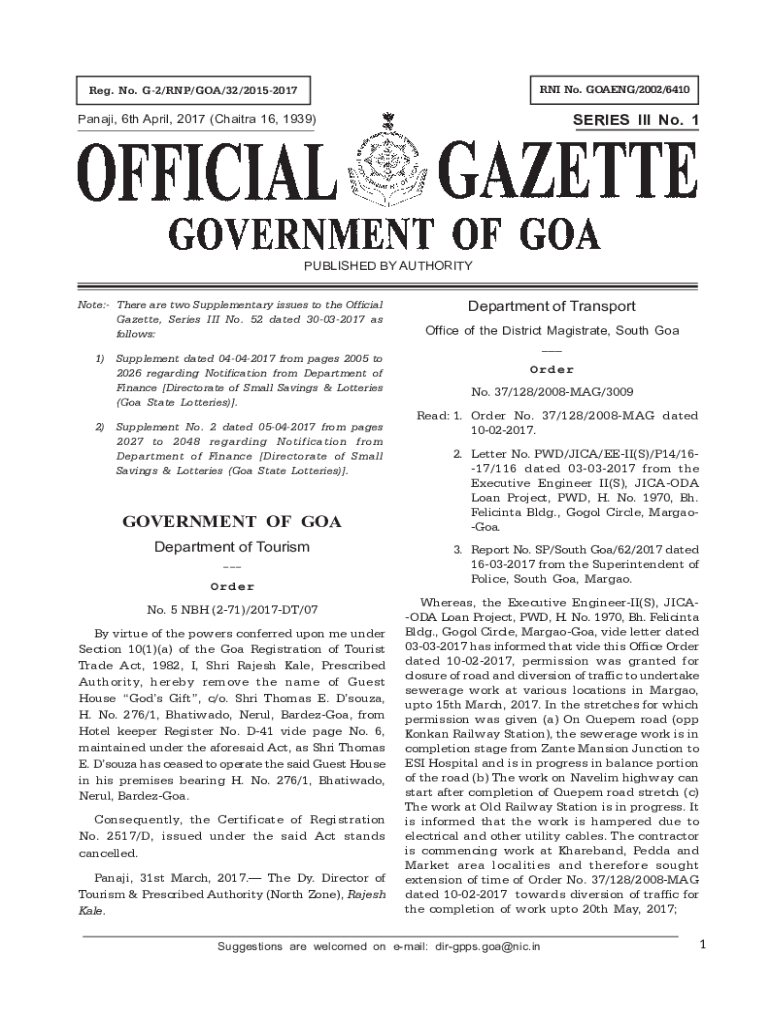 RNA No. GOING/2002/6410Reg. No. G2/RNA/GOA/32/20152017SERIES III No. 1Panaji, 6th April 2017 (Chair 16, 1939)PUBLISHED BY AUTHORITY Note: There are two Supplementary issues to the Official Gazette,