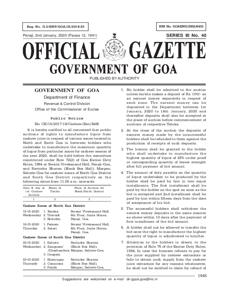 RNA No. GOING/2002/6410Reg. No. G2/RNA/GOA/32/201820SERIES III No. 40Panaji, 2nd January 2020 (Paula 12, 1941)PUBLISHED BY AUTHORITYGOVERNMENT OF GOA Department of Finance Revenue & Control Division