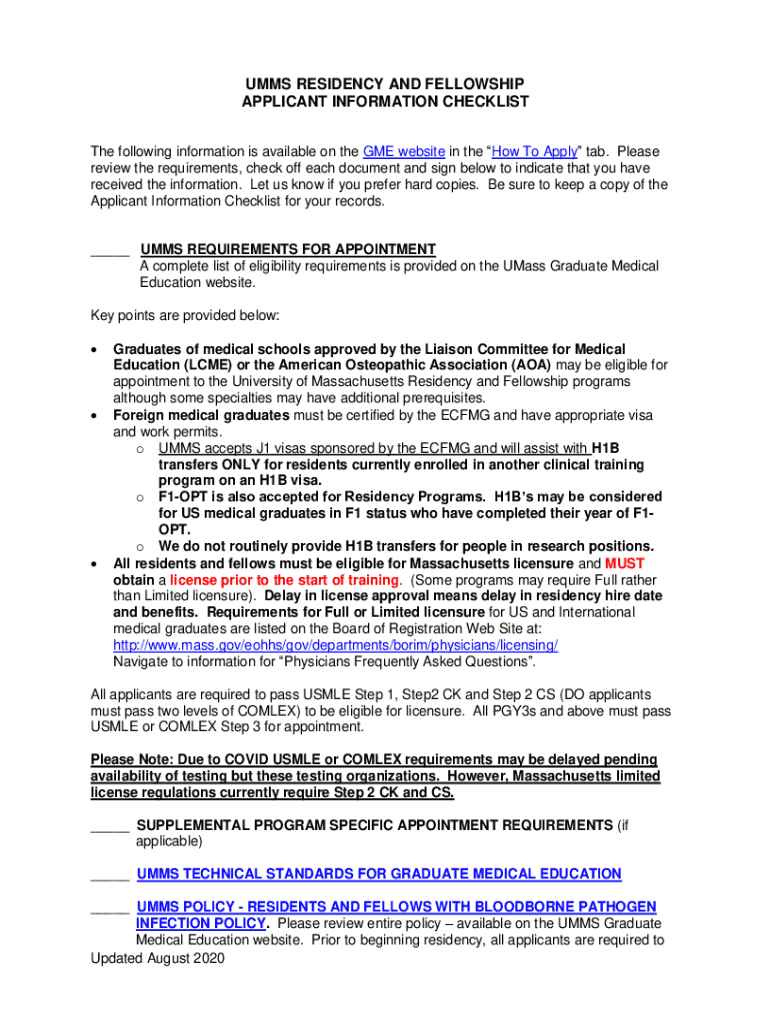 MMS RESIDENCY AND FELLOWSHIP APPLICANT INFORMATION CHECKLIST The following information is available on the ME website in the How To Apply tab. Please review the requirements, check off each document