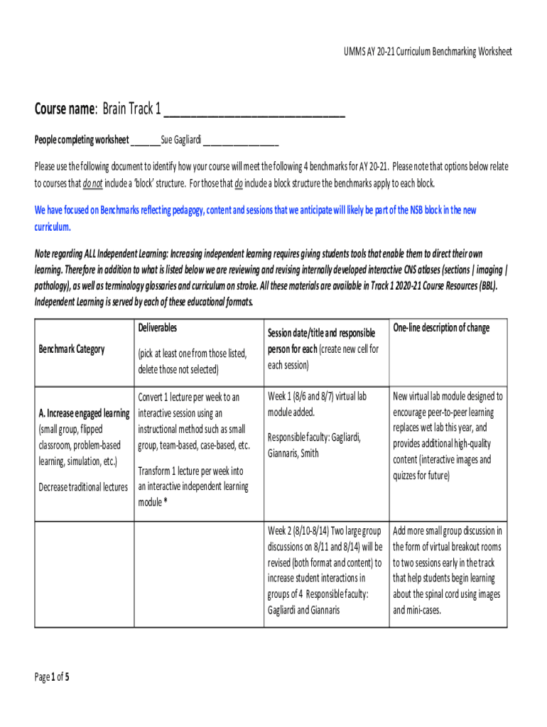 UMM, SAY 2021 Curriculum Benchmarking WorksheetCourse name: Brain Track 1 ___ People completing worksheet ___Sue Cagliari ___ Please use the following document to identify how your course will meet