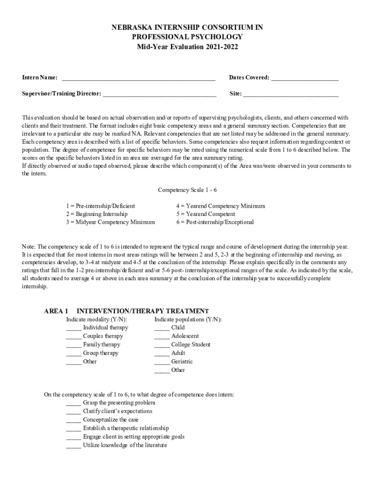 Midyear Evaluation 20212022Intern Name: ___Dates Covered: ___Supervisor/Training Director: ___Site: ___This evaluation should be based on