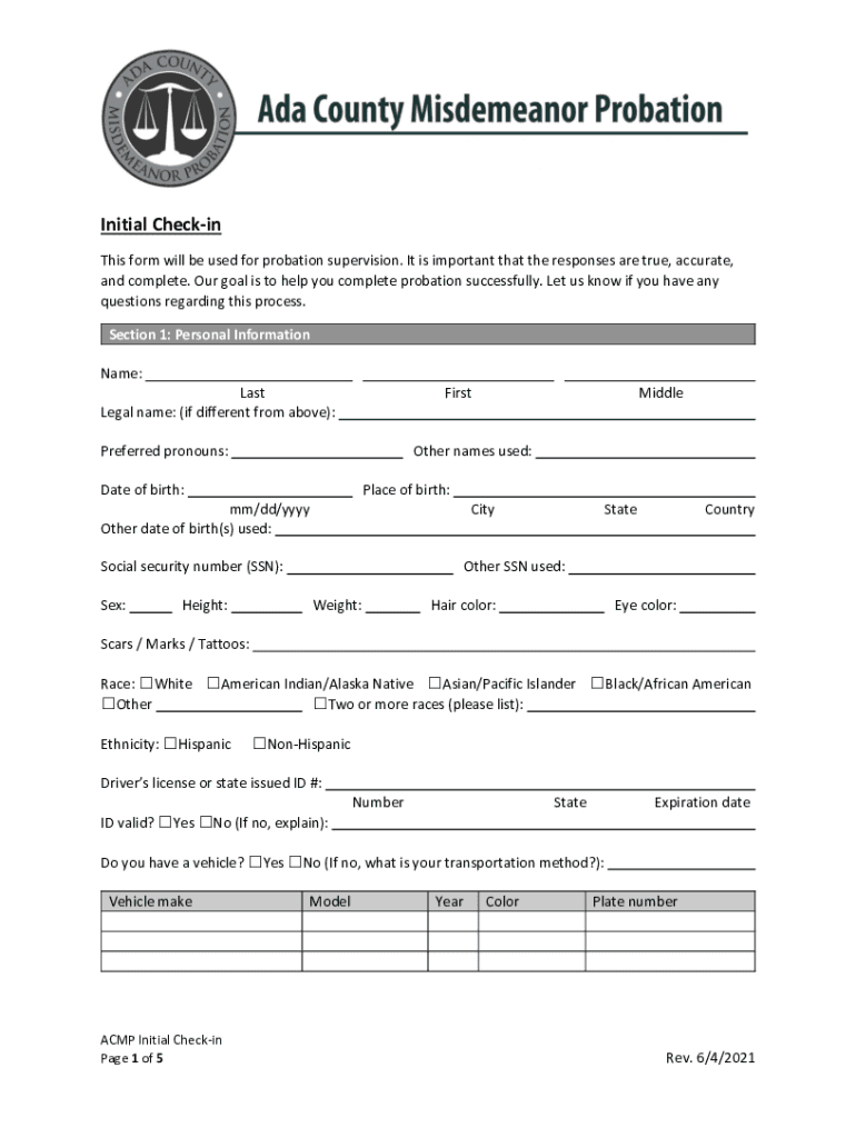 Initial Checking This form will be used for probation supervision. It is important that the responses are true, accurate, and complete. Our goal is to help you complete probation successfully. Let