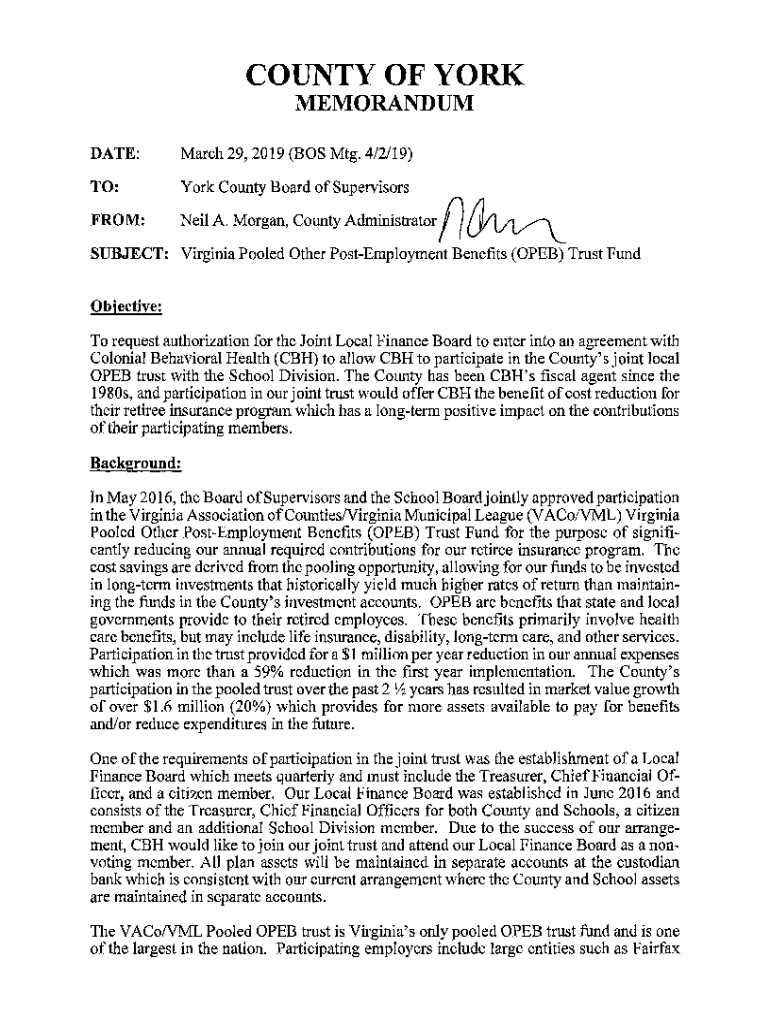 COUNTY OF YORK MEMORANDUM DATE:March 29, 2019 (BOS Mtg. 4/2/19)TO:York County Board of SupervisorsFROM:Neil A. Morgan, CountyAdministrator!/SUBJECT: Virginia Pooled Other Pre-employment Benefits (OPEN)