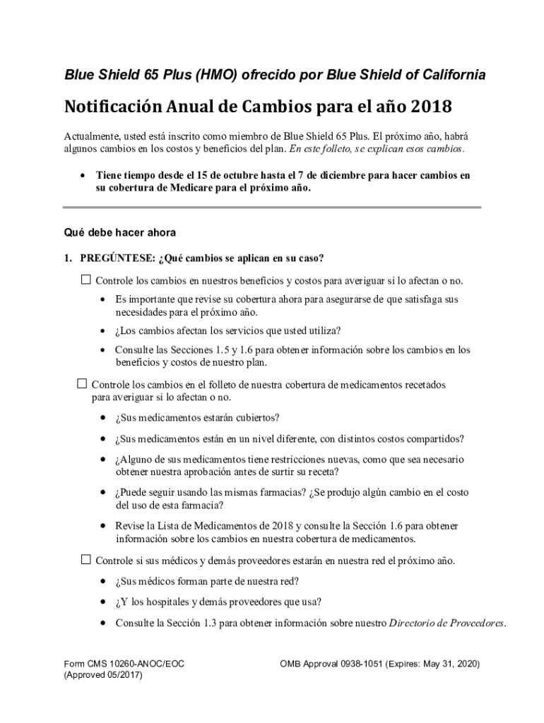Blue Shield 65 Plus (HMO) Freida POR Blue Shield of CaliforniaNotificacin Annual de Cambios para el AO 2018