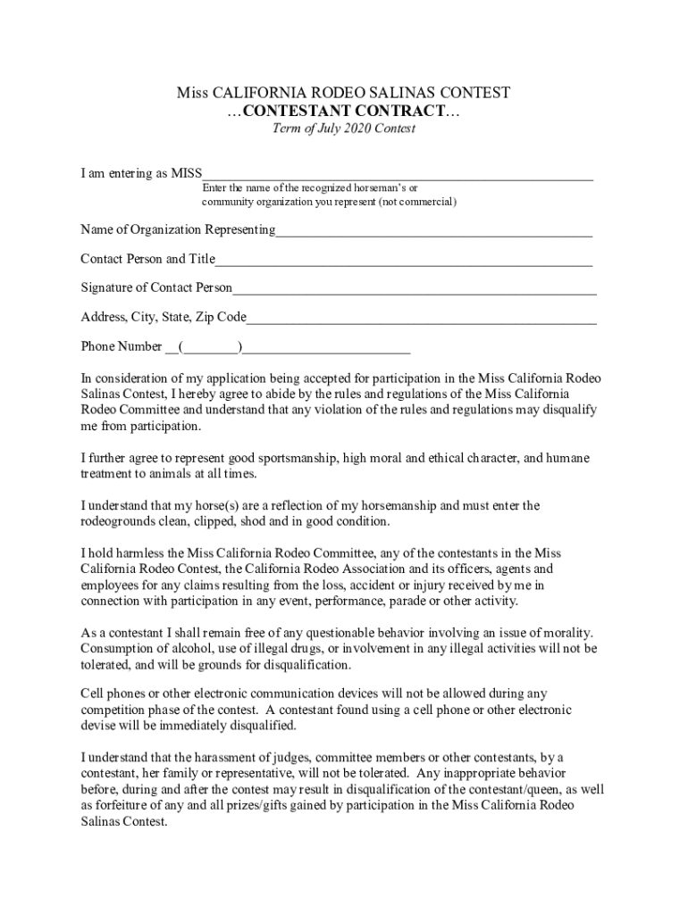 Miss CALIFORNIA RODEO SALINAS CONTEST CONTESTANT CONTRACT Term of July 2020 Contest am I entering as MISS___ Enter the name of the recognized horsemen or community organization you represent (not