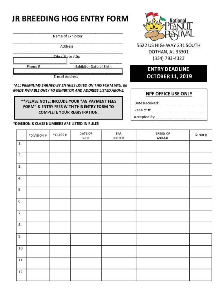 JUNIOR BREEDING HOG SHOW Time: Wednesday, November 6, 2019 10:00 AM Checking: Tuesday, November 5, 2019, from 3:00 PM to 6:00 PM (Be sure to bring health certificate & birth certificate to check in)