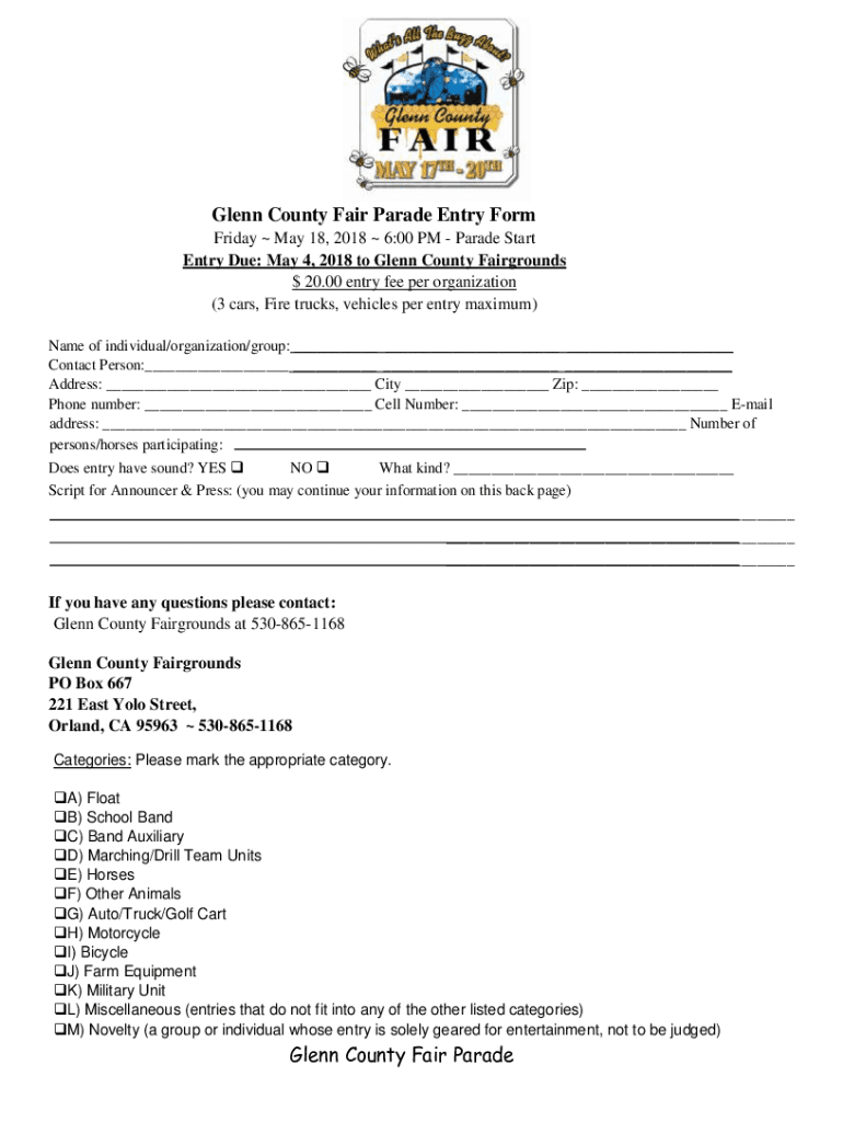 Glenn County Fair Parade Entry Form Friday, May 18, 2018 6:00 PM Parade Start Entry Due: May 4, 2018, to Glenn County Fairgrounds $20.00 entry fee per organization (3 cars, Fire trucks, vehicles per