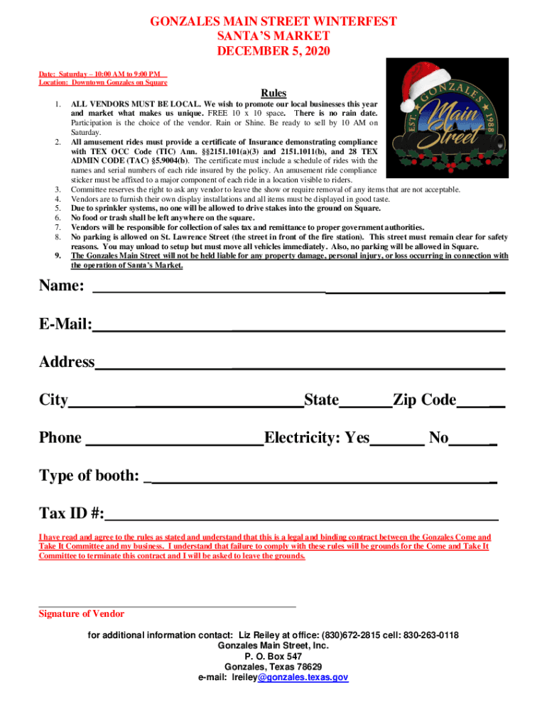 GONZALES MAIN STREET INTEREST SANTA MARKET DECEMBER 5, 2020, Date: Saturday 10:00 AM to 9:00 PM Location: Downtown Gonzales on Squares 1.2.3. 4. 5. 6. 7. 8. 9.ALL VENDORS MUST BE LOCAL. We wish to