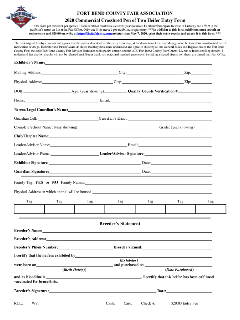 FORT BEND COUNTY FAIR ASSOCIATION 2020 Commercial Crossbred Pen of Two Heifer Entry Form One form per exhibitor per species Each exhibitor must have a current year notarized Exhibitor/Participant