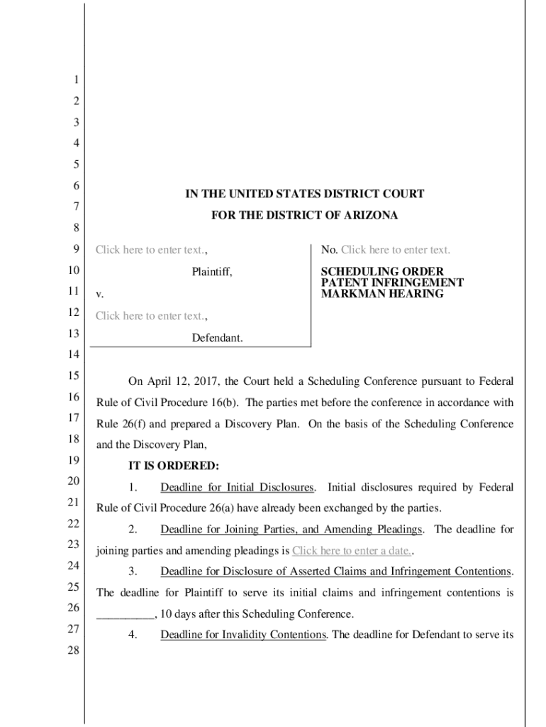 1 2 3 4 5 6IN THE UNITED STATES DISTRICT COURT7FOR THE DISTRICT OF ARIZONA8 9Click here to enter text.,10Plaintiff,11v.12Click here to enter text.,13No. Click here to enter text. SCHEDULING ORDER