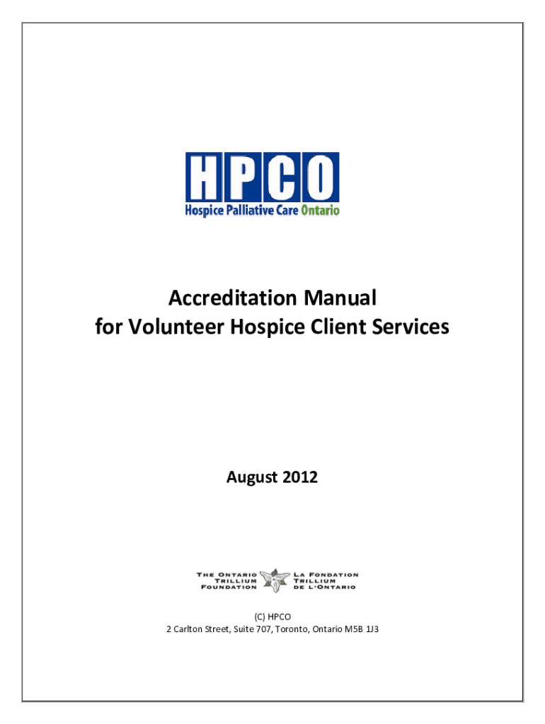 Accreditation Manual for Volunteer Hospice Client Services August 2012(C) HPC 2 Carlton Street, Suite 707, Toronto, Ontario M5B 1J3This page intentionally blankets a great process so grateful to HPC