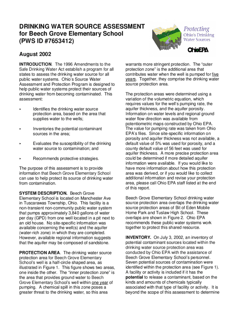 DRINKING WATER SOURCE ASSESSMENT for Beech Grove Elementary School (PCs ID #7653412) August 2002 INTRODUCTION. The 1996 Amendments to the Safe Drinking Water Act establish a program for all states