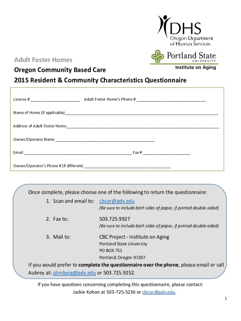 Adult Foster Homes Oregon Community Based Care 2015 Resident & Community Characteristics Questionnaire License # ___ Adult Foster Homes Phone # ___ Name of Home (if applicable)___ Address of Adult