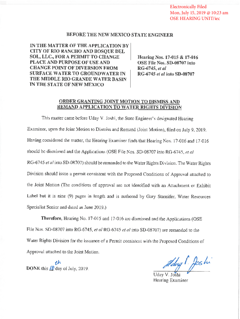 Electronically Filed Mon, July 15, 2019 @ 10:23 am ONE HEARING UNIT/IEC BEFORE THE NEW MEXICO STATE ENGINEER IN THE MATTER Of THE APPLICATION BY CITY OF RIO RANCHO AND MOSQUE DEL SOL, LLC., FOR A