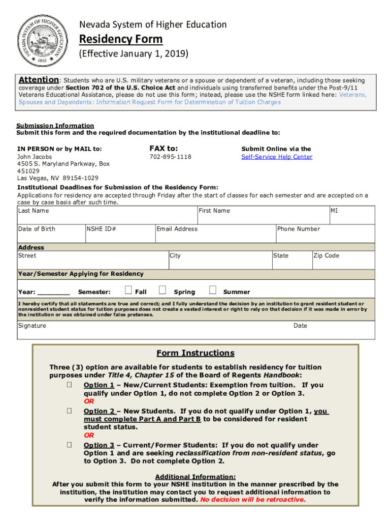 Nevada System of Higher EducationResidency Form(Effective January 1, 2019)