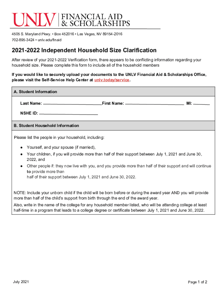 4505 S. Maryland Pkwy. Box 452016 Las Vegas, NV 891542016 7028953424 unlv.edu/finaid20212022 Independent Household Size Clarification After review of your 20212022 Verification form, there appears