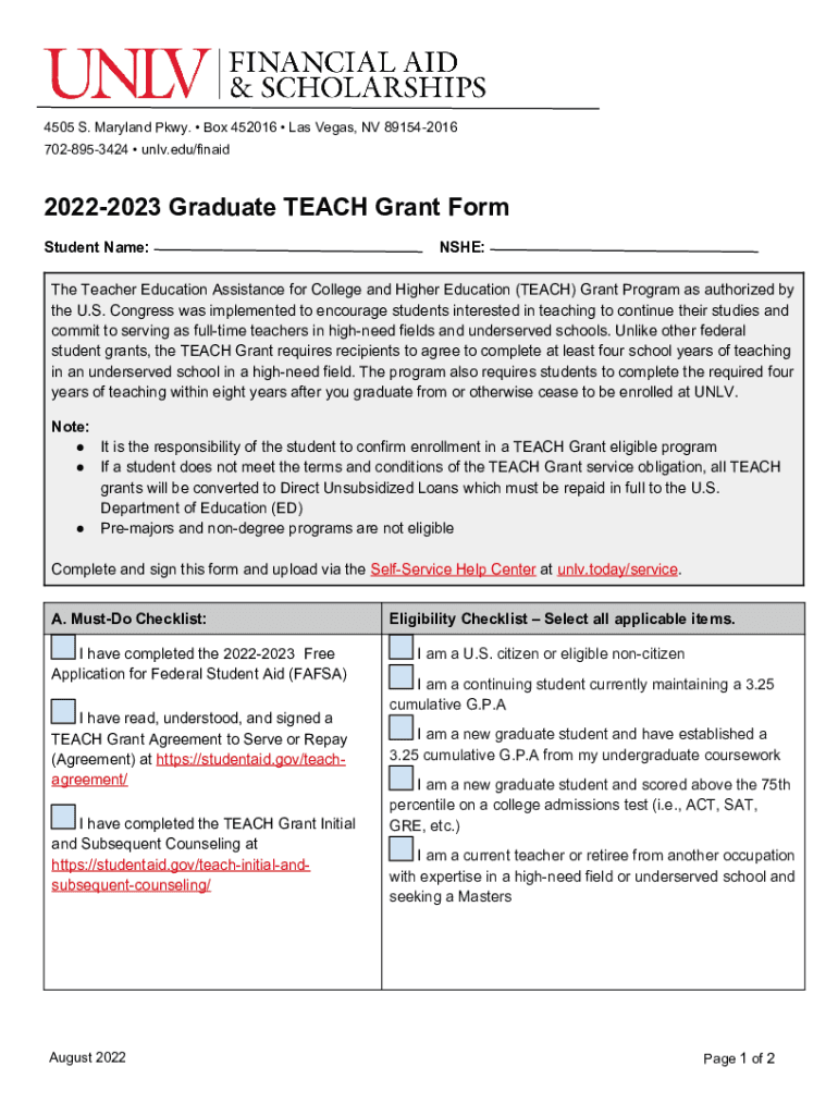 4505 S. Maryland Pkwy. Box 452016 Las Vegas, NV 891542016 7028953424 unlv.edu/finaid20222023 Graduate TEACH Grant Form Student Name:SHE:The Teacher Education Assistance for College and Higher Education