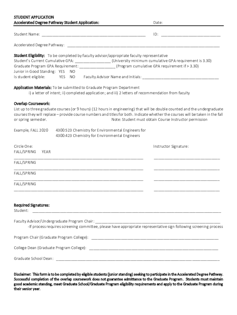 STUDENT APPLICATION Accelerated Degree Pathway Student Application:Date:Student Name: ___ID: ___Accelerated Degree Pathway: ___ Student Eligibility: To be completed by faculty advisor/appropriate