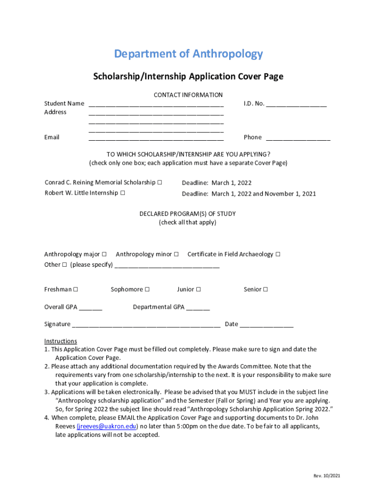 Department of Anthropology Scholarship/Internship Application Cover Page CONTACT INFORMATION Student Name ___ Address ___ ___ ___ Email ___I. D. No. ___Phone ___TO WHICH SCHOLARSHIP/INTERNSHIP ARE