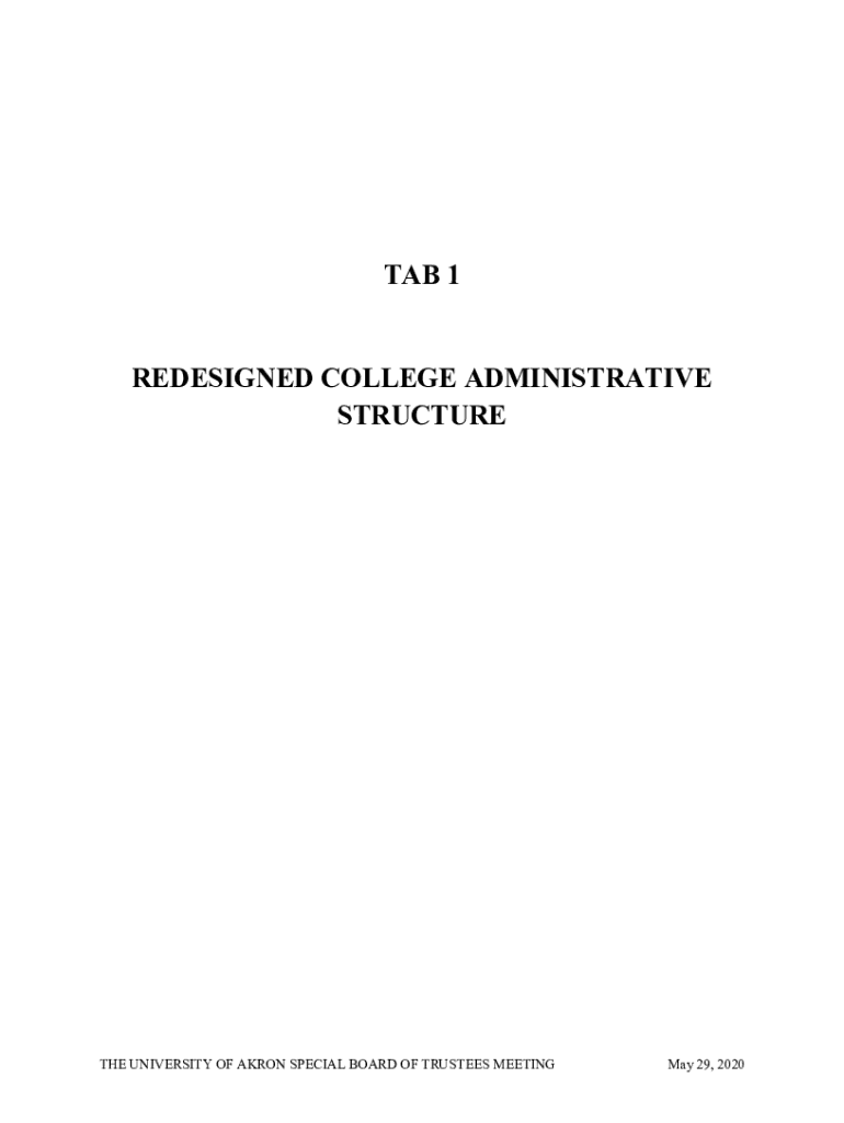 TAB 1 REDESIGNED COLLEGE ADMINISTRATIVE STRUCTURE UNIVERSITY OF AKRON SPECIAL BOARD OF TRUSTEES MEETING May 29, 2020Redesign of the Academic Structure The University of Akron community has had ongoing