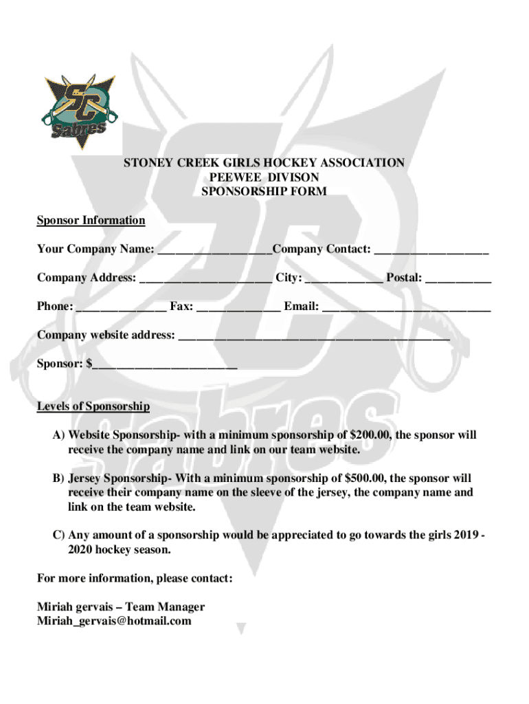 STONE CREEK GIRLS HOCKEY ASSOCIATION PEEWEE DIVISION SPONSORSHIP FORM Sponsor Information Your Company Name: ___Company Contact: ___ Company Address: ___ City: ___ Postal: ___ Phone: ___ Fax: ___