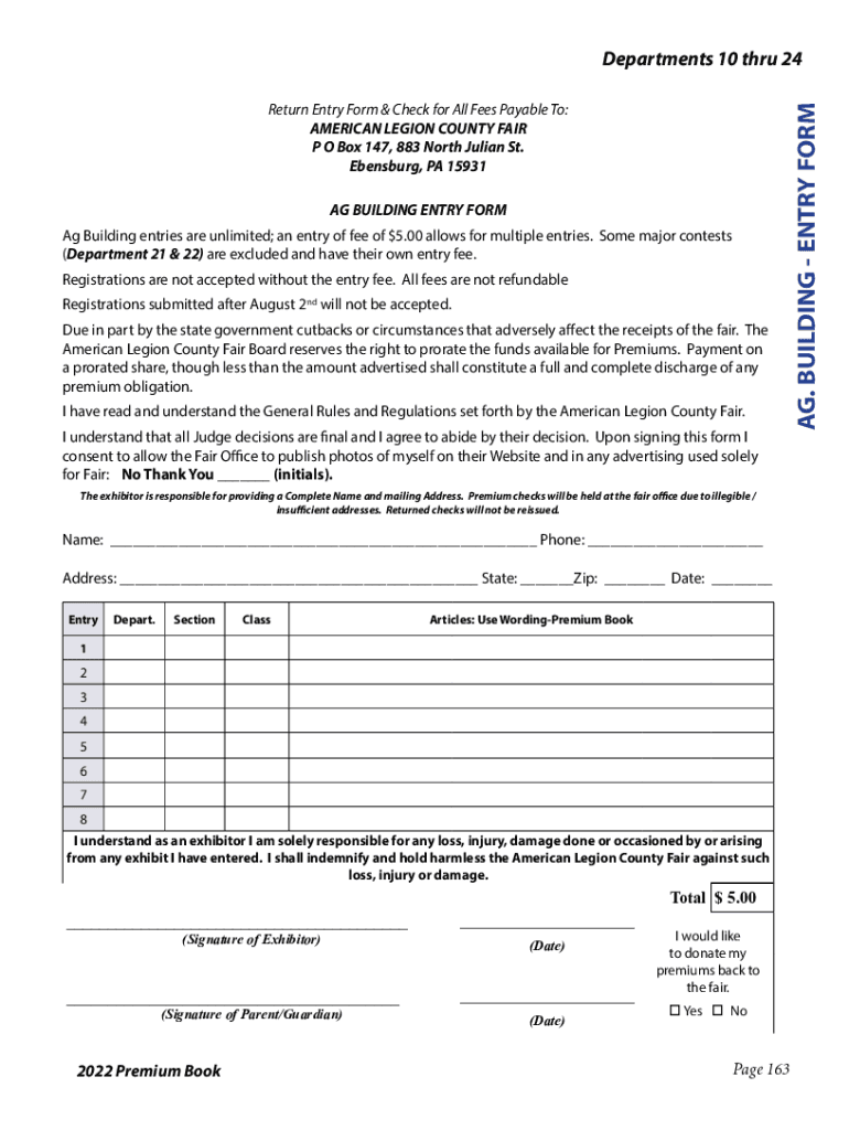 Return Entry Form & Check for All Fees Payable To: AMERICAN LEGION COUNTY FAIR P O Box 147, 883 North Julian St. Ellensburg, PA 15931 AG BUILDING ENTRY FORM Ag Building entries are unlimited; an entry