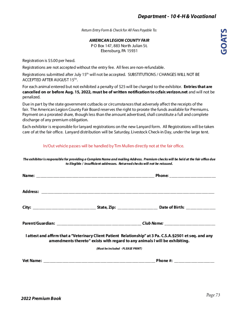 Department 10 4H & VocationalGOATSReturn Entry Form & Check for All Fees Payable To:AMERICAN LEGION COUNTY FAIR P O Box 147, 883 North Julian St. Ellensburg, PA 15931 Registration is $5.00 per head.