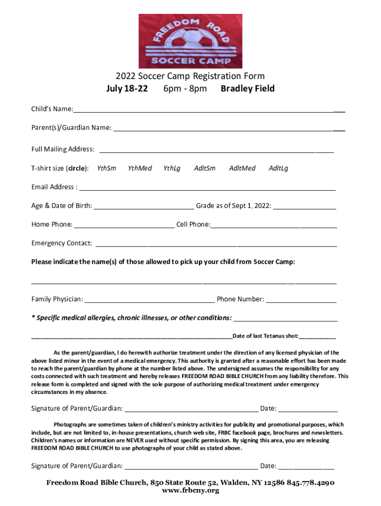 2022 Soccer Camp Registration Form July 1822 6pm 8pm Bradley Field Child's Name:___ Parent(s)/Guardian Name: ___ Full Mailing Address: ___ Shirt size (circle):YthSmYthMedYthLgAdltSmAdltMedAdltLgEmail