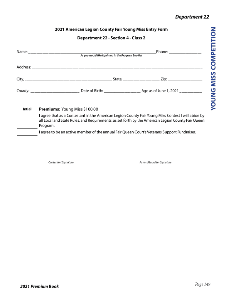 2021 American Legion County Fair Young Miss Entry Form Department 22 Section 4 Class 2 Name: ___Phone: ___ As you would like it printed in the Program BookletAddress: ___ City, ___ State, ___ Zip: