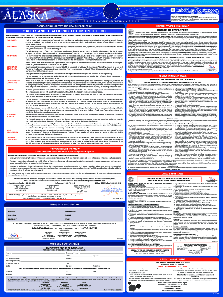 ALASKA18007459970 Product ID: AK60OCCUPATIONAL SAFETY AND HEALTH PROTECTIONUNEMPLOYMENT INSURANCESAFETY AND HEALTH PROTECTION ON THE NOTICE TO EMPLOYEESEach employer shall furnish to each of his employees,