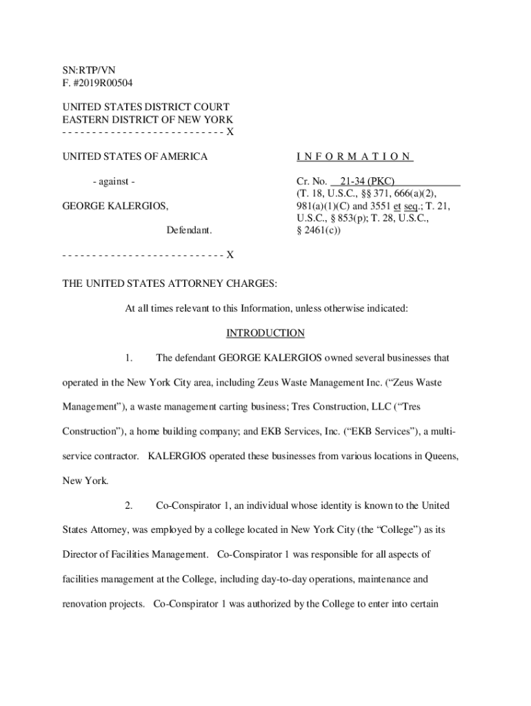 SN:RTP/VN F. #2019R00504 UNITED STATES DISTRICT COURT EASTERN DISTRICT OF NEW YORK X UNITED STATES OF AMERICAINFORMATION Cr. No. 2134 (PC) (T. 18, U.S.C., 371, 666(a)(2), 981(a)(1)(C) and 3551 et