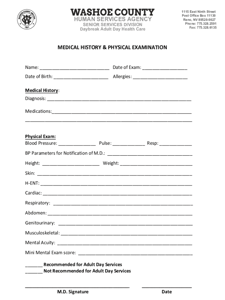 HUMAN SERVICES AGENCY SENIOR SERVICES DIVISION Daybreak Adult Day Health Care1115 East Ninth Street Post Office Box 11130 Reno, NV 895200027 Phone: 775.328.2591 Fax: 775.328.6135MEDICAL HISTORY &
