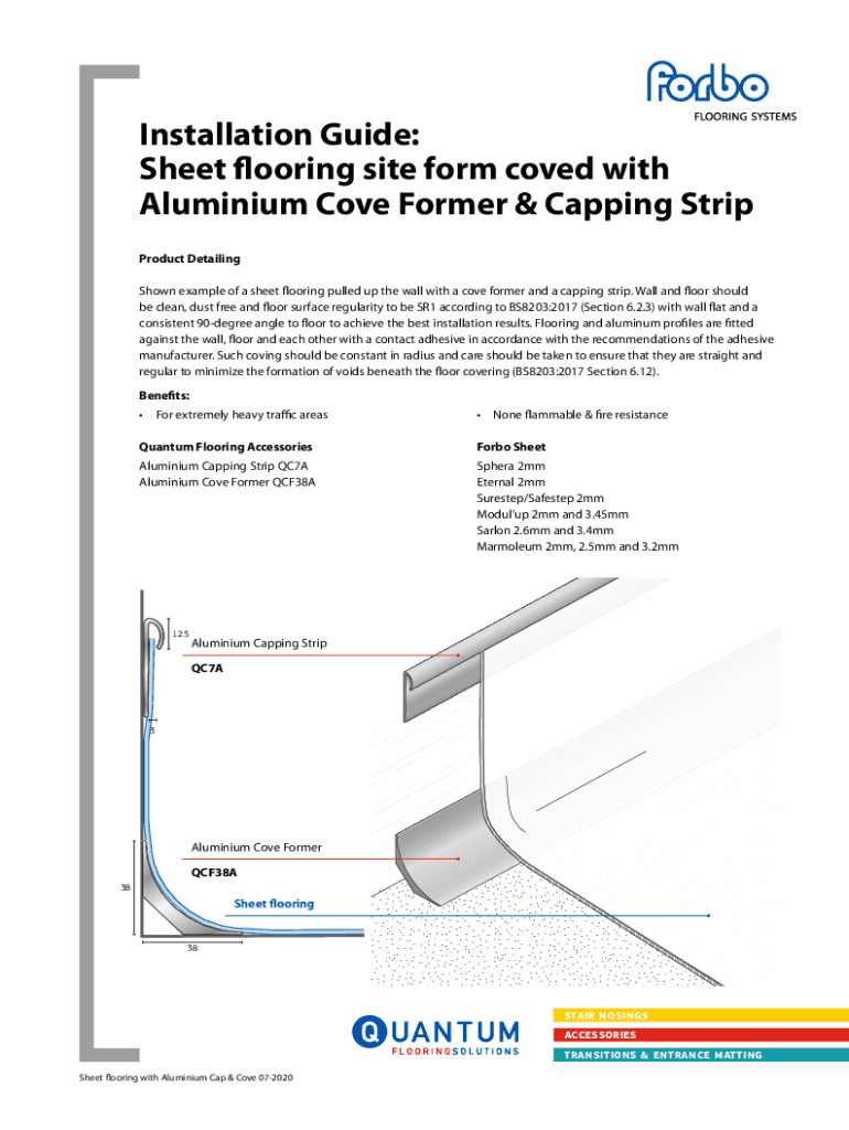 Installation Guide: Sheet flooring site form moved with Aluminum Cove Former & Capping Strip Product Detailing Shown example of a sheet flooring pulled up the wall with a cove former and a capping