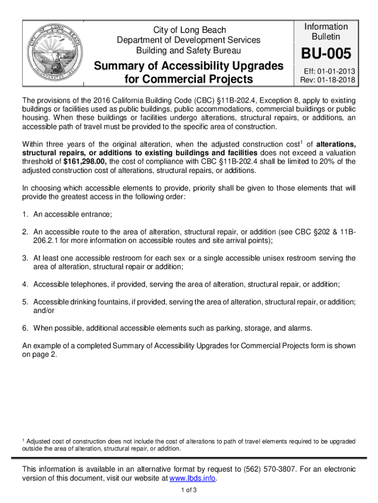 City of Long Beach Department of Development Services Building and Safety BureauSummary of Accessibility Upgrades for Commercial ProjectsInformation BulletinBU005 Eff: 01012013 Rev: 01182018The provisions