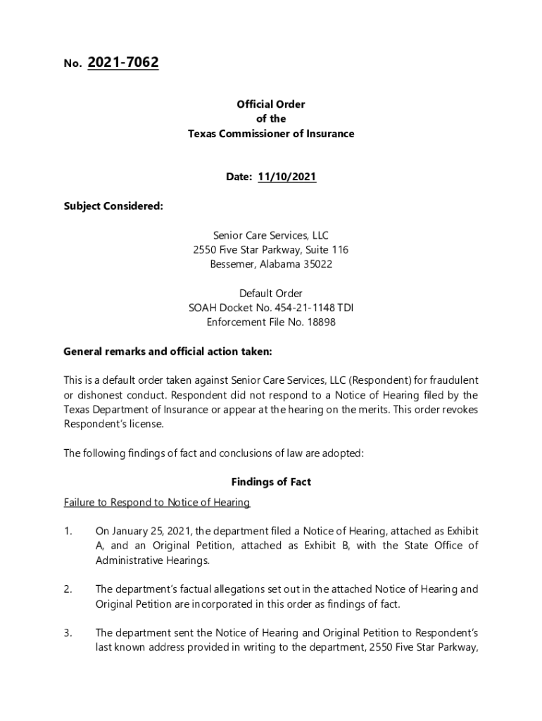 No.20217062 Official Order of the Texas Commissioner of Insurance Date: 11/10/2021Subject Considered: Senior Care Services, LLC 2550 Five-Star Parkway, Suite 116 Bessemer, Alabama 35022 Default Order