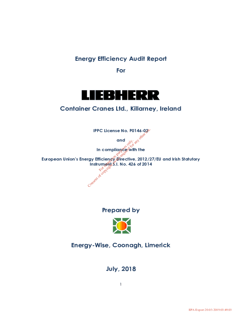 Energy Efficiency Audit Report Container Cranes Ltd., Hillary, Irelandotto f c FO op r i yr NS IG PE ht ct ow ion né PU r RP EQ OS UI BS re o d NL for y. Ra nyandheruse.IPC License No. P014602In