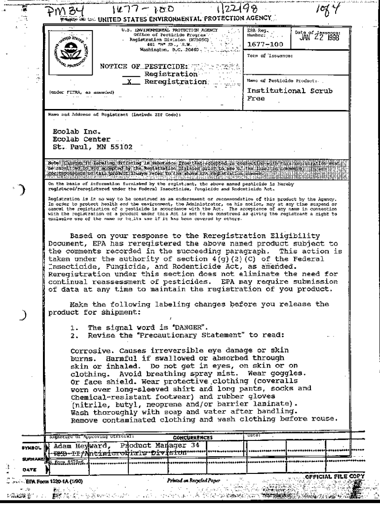Office of Pesticide Program\' \'i.c\” Registration Division H150SC.:401 H St., s.w.