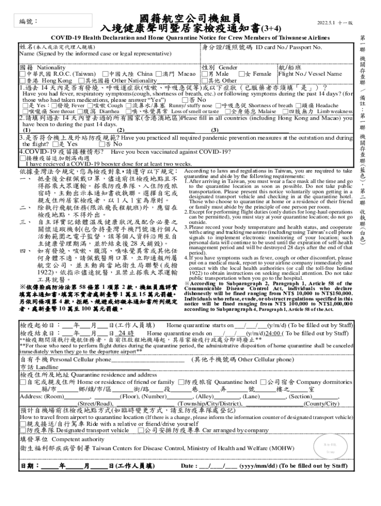 (3+4)2022.5.1 COVID-19 Health Declaration and Home Quarantine Notice for Crew Members of Taiwanese Airlines()/ ID card No./ Passport No. Name (Signed by the informed case or legal representative)