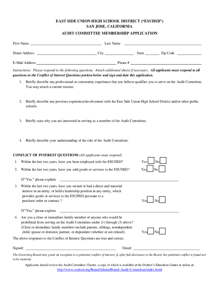 EAST SIDE UNION HIGH SCHOOL DISTRICT SEEKS AUDIT COMMITTEE APPLICANTS The District invites applications from persons interested in serving on the school districts Audit Committee. Applicants must