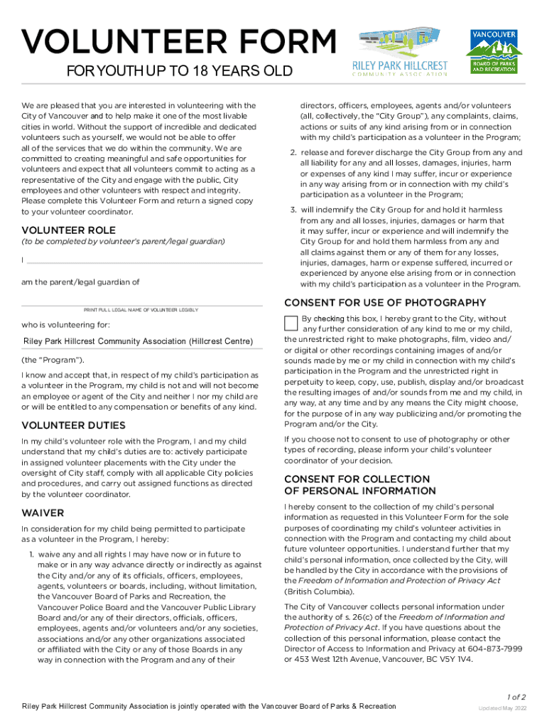 VOLUNTEER FORM FOR YOUTH UP TO 18 YEARS OLD We are pleased that you are interested in volunteering with the City of Vancouver and to help make it one of the most livable cities in world. Without the