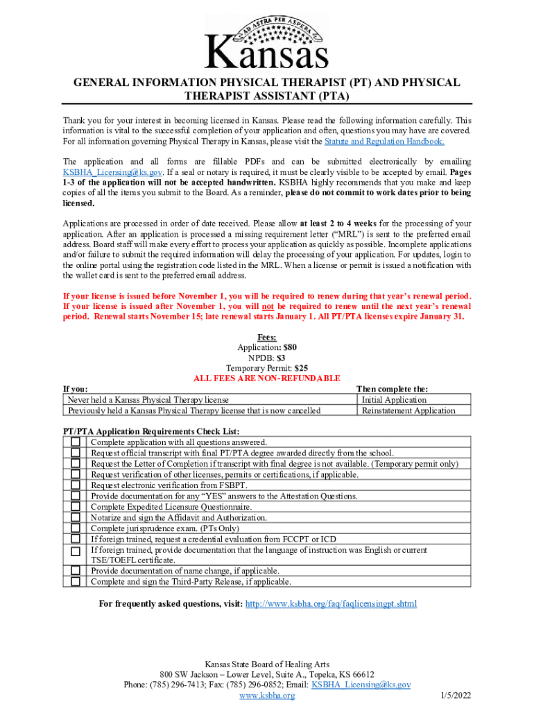 GENERAL INFORMATION PHYSICAL THERAPIST (PT) AND PHYSICAL THERAPIST ASSISTANT (PTA) Thank you for your interest in becoming licensed in Kansas. Please read the following information carefully. This