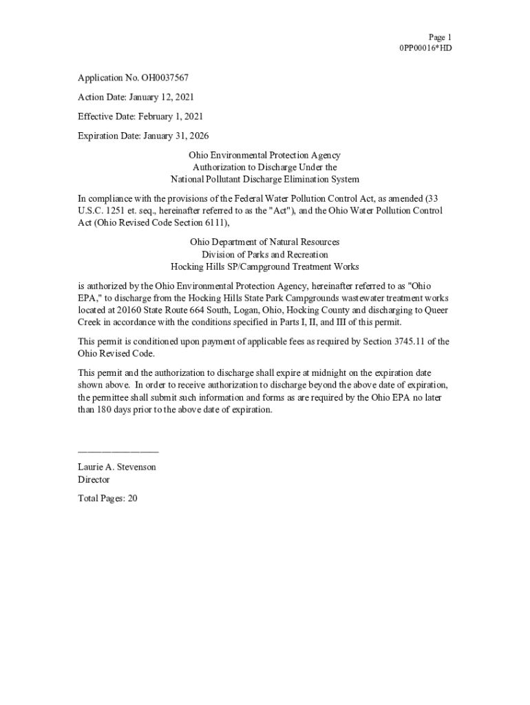 Page 1 0PP00016×Application No. OH0037567 Action Date: January 12, 2021, Effective Date: February 1, 2021, Expiration Date: January 31, 2026 Ohio Environmental Protection Agency Authorization to