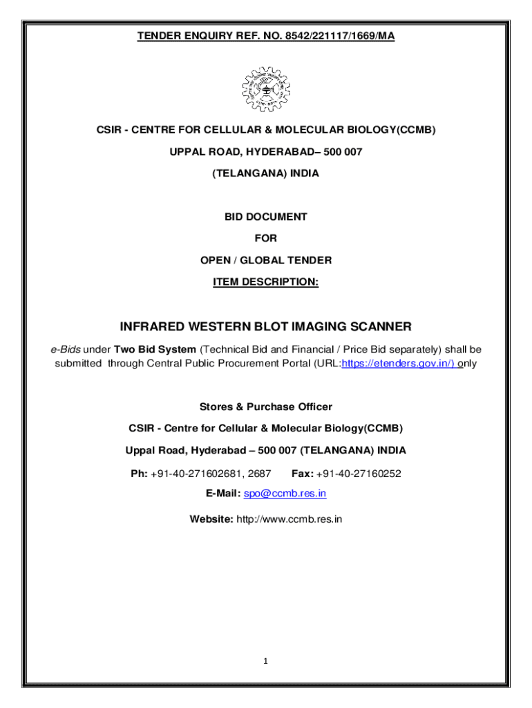 TENDER Inquiry REF. NO. 8542/221117/1669/MACS IR Center FOR CELLULAR & MOLECULAR BIOLOGY(COMB) UP PAL ROAD, HYDERABAD 500 007 (TELANGANA) INDIA BID DOCUMENT FOR OPEN / GLOBAL TENDER ITEM DESCRIPTION:INFRARED