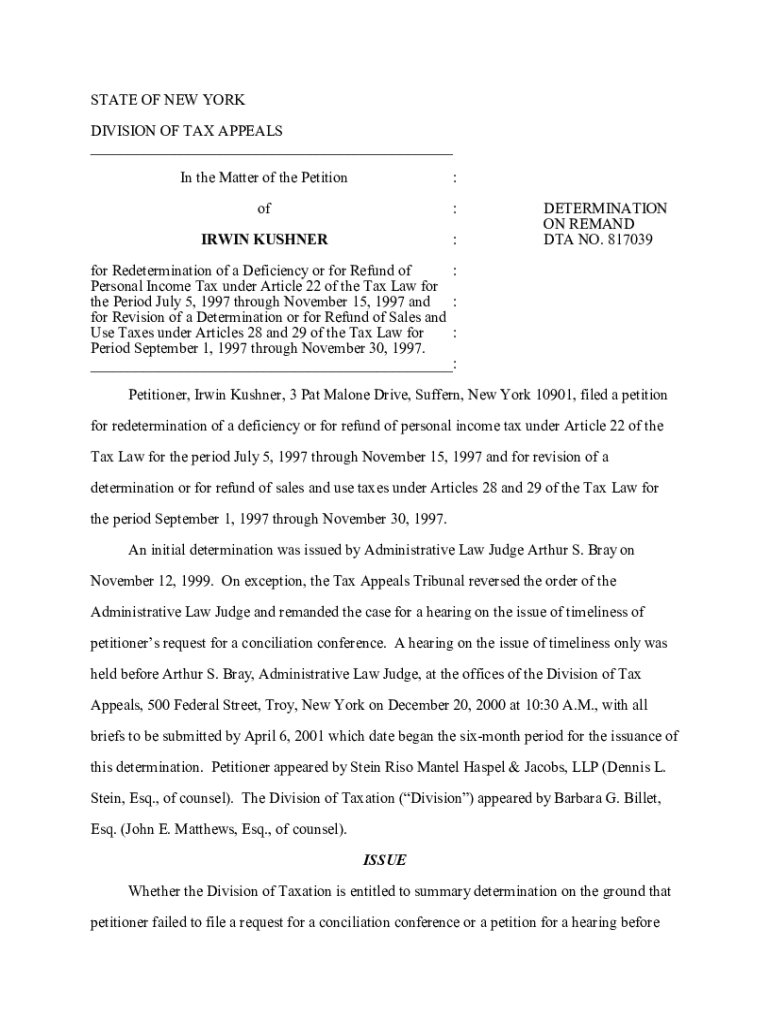 STATE OF NEW YORK DIVISION OF TAX APPEALS ___ In the Matter of the Petition:of:IRWIN KUSHNER:DETERMINATION ON REMAND DTA NO. 817039for Redetermination of a Deficiency or for Refund of : Personal Income