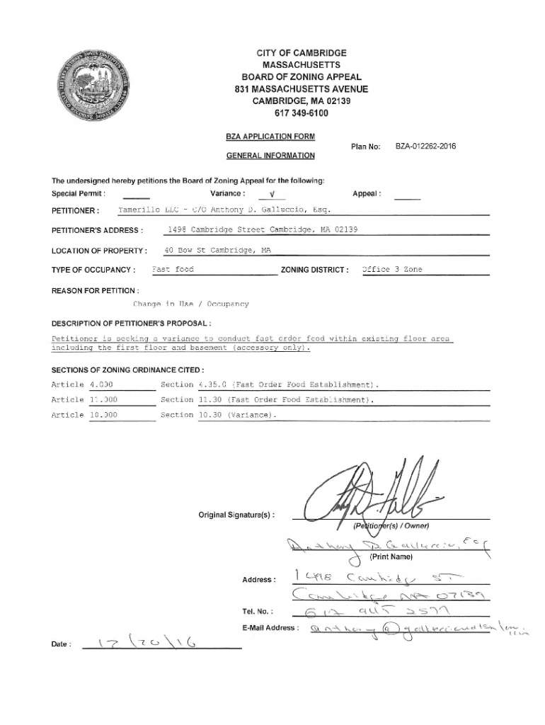 CITY OF CAMBRIDGE MASSACHUSETTS BOARD OF ZONING APPEAL 831MASSACHUSETTSAVENUE CAMBRIDGE, MA 02139 617 3496100 BZA APPLICATION FORMBZA0122622016Plan No: GENERAL Information undersigned hereby petitions