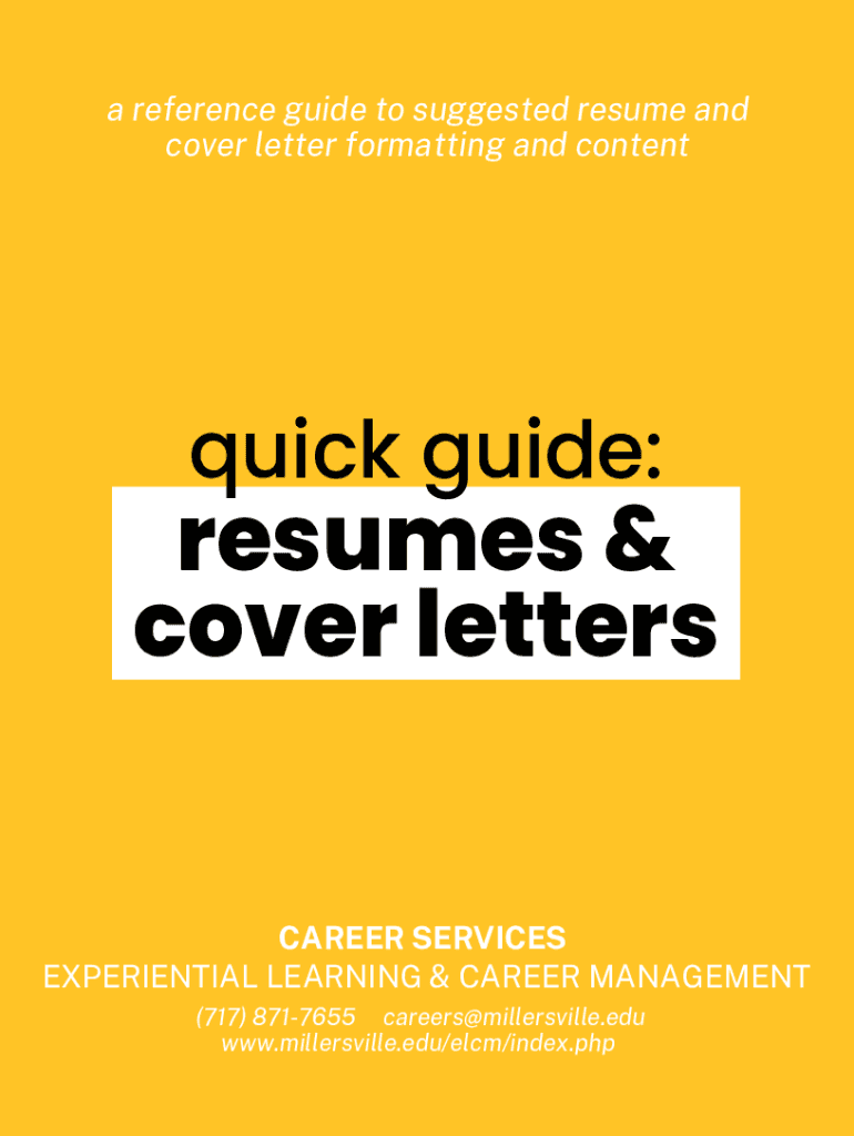 A reference guide to suggested resume and cover letter formatting and content quick guide:resumes & cover letters CAREER SERVICES EXPERIENTIAL LEARNING & CAREER MANAGEMENT (717) 8717655 careers@millersville.edu